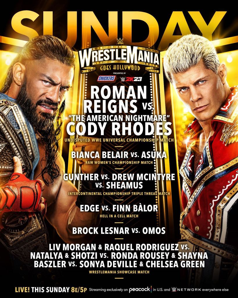 It’s that time of year again, WRESTLEMANIA IS HERE! This year the WWE goes Hollywood, in the 39th installment of it’s yearly MEGA event. The Tribal Chief Romans Reigns will main event the show on Night 2 by defending the Undsiputed WWE Universal Championship against the challenger Cody Rhodes. John Cena is also set to return to challenge Austin Theory for the United States Championship.