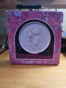 At just under 9 inches in diameter, it’s a versatile piece to display in a cabinet, on a stand, or even to incorporate into themed décor. The plate has never been used/displayed, but the original box has some slight damage on its edges. Priced affordably, this plate is a lovely way to own a piece of Precious Moments history without breaking the bank.